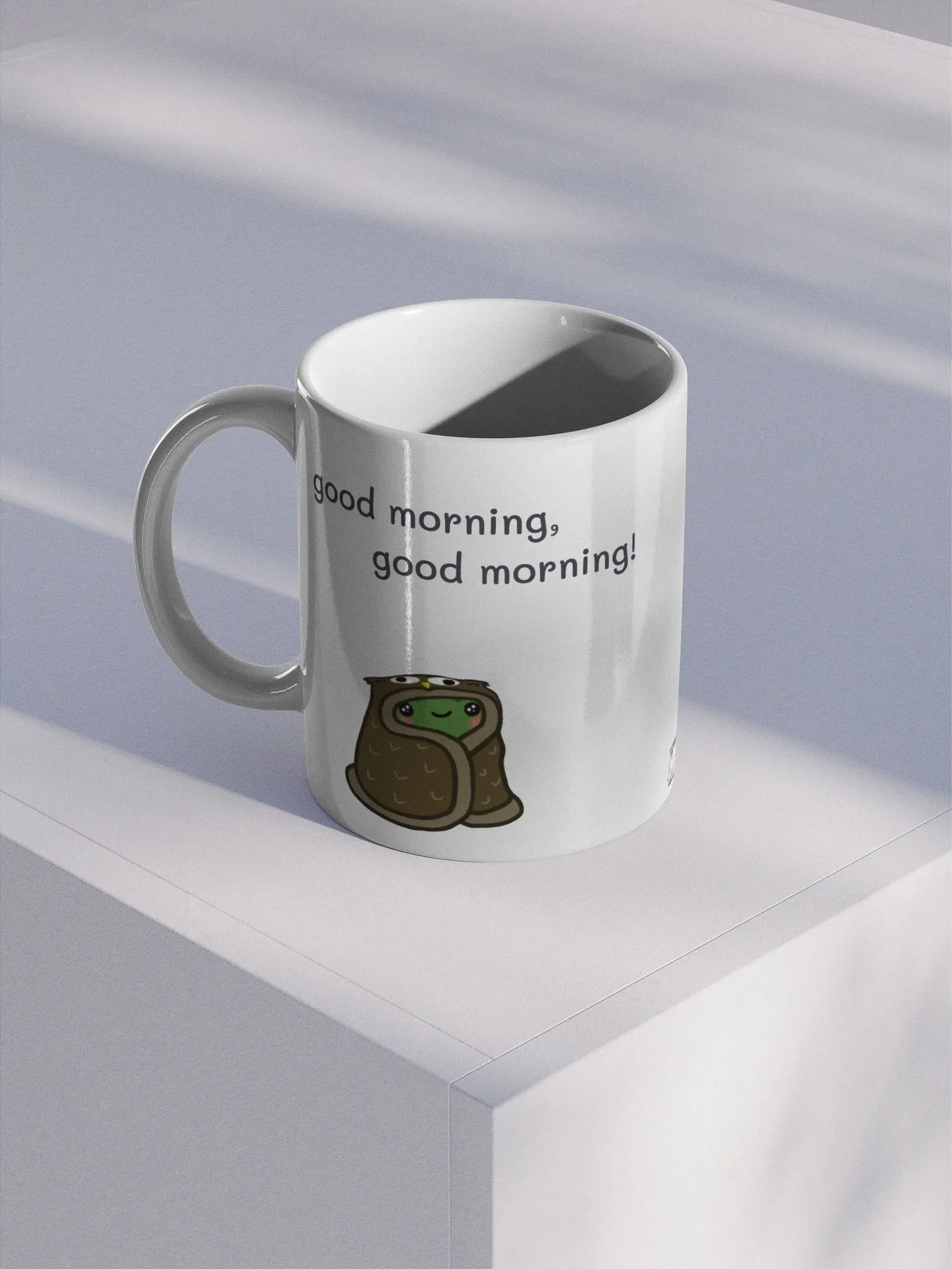 This mug features a frog in an owl themed blanket with a line I typically say at the beginning of every stream, with a sun and clouds on the opposite side.